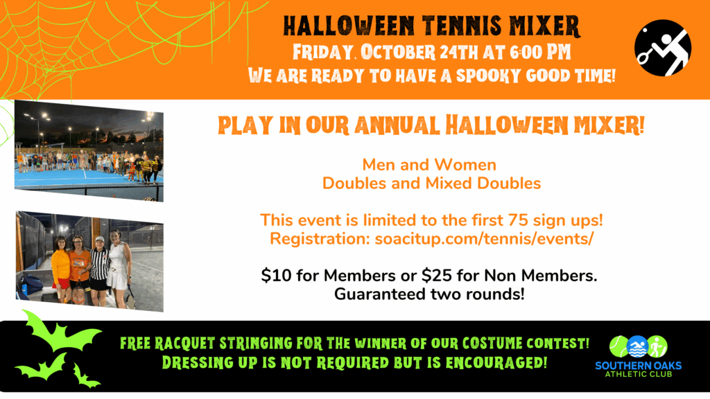 Join us for our annual Halloween mixer! This is by far one of our biggest events of the year. We will limit this to the first 75 who sign up. There will be a Wilson demo day before the mixer starts and we will have all the rackets out for demo that night. There will be multiple rounds with everyone getting at least two rounds. The Patio will be open serving food and drinks all night!